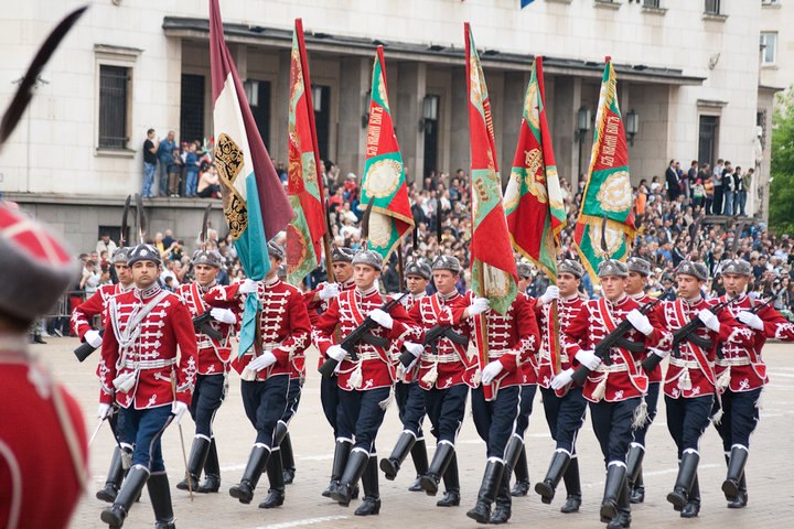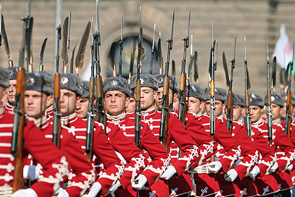 gvardeiciНАЦИОНАЛНАТА ГВАРДЕЙСКА ЧАСТНационалната гвардейска част е приемник на създадената през 1879 г. лична гвардия на княз Александър І Батенберг. На 12 юли е осъществен първият официален ескорт на български княз. Затова 12 юли е официален празник на Националната гвардейска част. През годините гвардейската структура се променя от конвой на княза, в ескадрон, полк, а след 1942 г. – дивизион. Днес в нея са включени войскови единици за отдаване на военни почести и представителен духов оркестър.